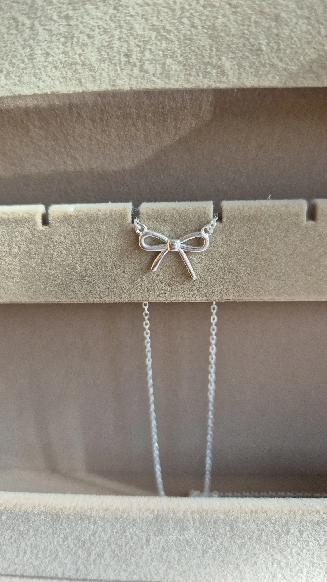 This sterling silver necklace features a delicate bowknot pendant necklace that rests smoothly on a sterling silver chain. Crafted in 925 sterling silver, the silver necklace layers beautifully as a chain necklace or long necklace for everyday shine. Perfect for necklace and pendant pairings, it adds a subtle charm necklace touch to sterling silver jewlery sets.