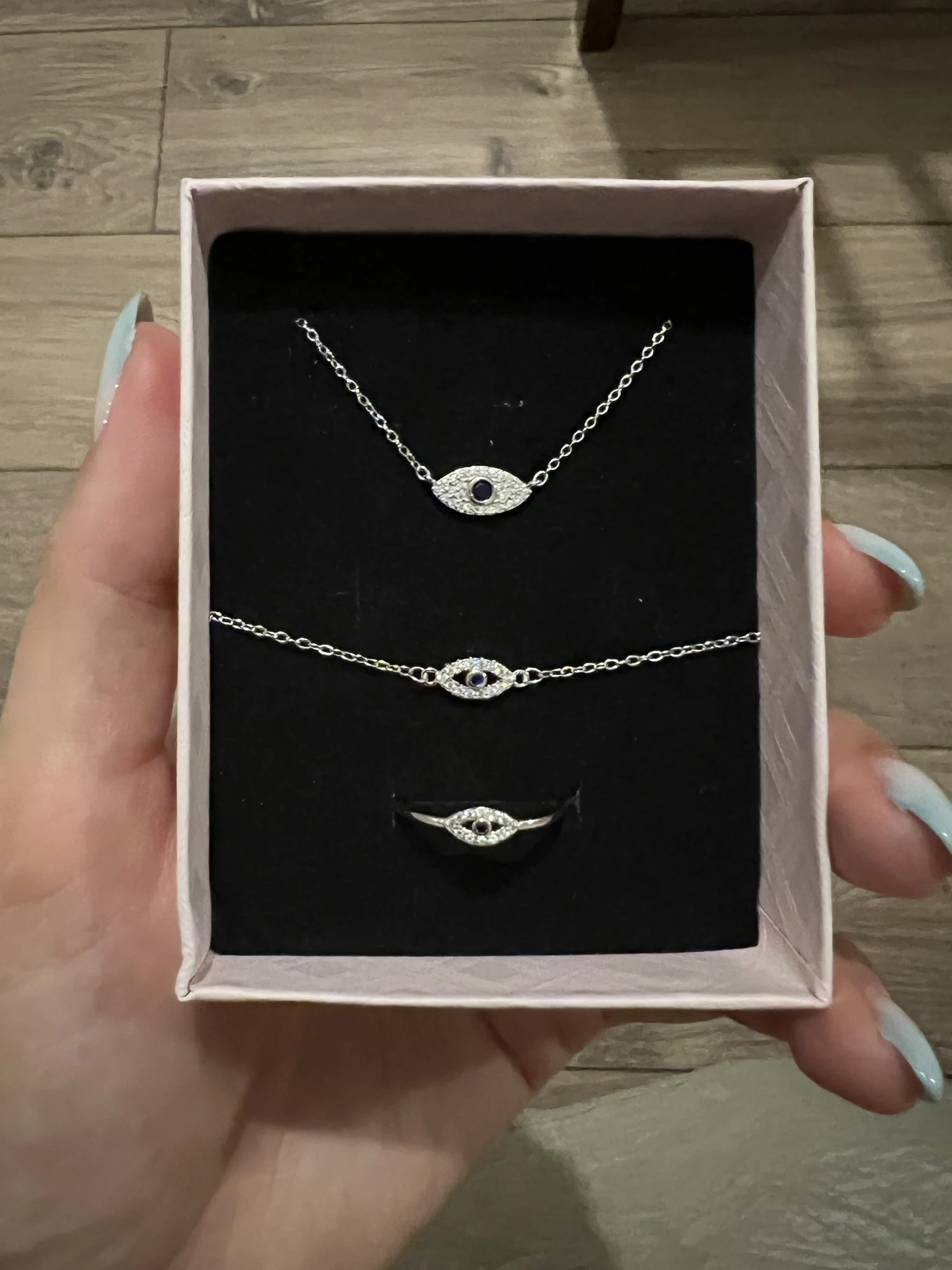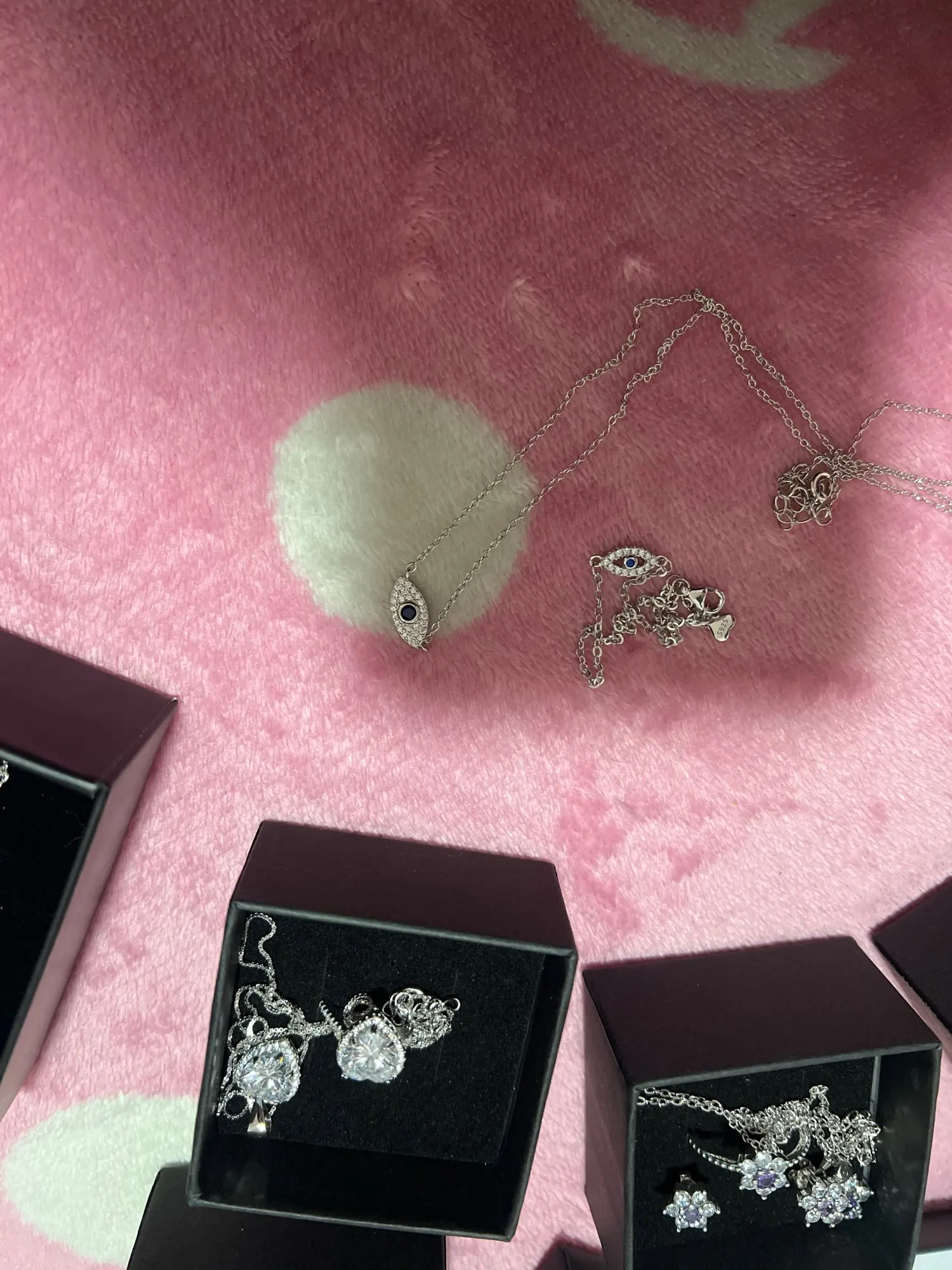 This silver jewelry ensemble pairs a sterling silver necklace with coordinated pieces in 925 sterling silver for everyday shine. Designed to layer as necklace and necklace, it complements a silver necklace stack and Sterling rings styling. Choosing your fit is simple with clear ring size notes for a comfortable finish.