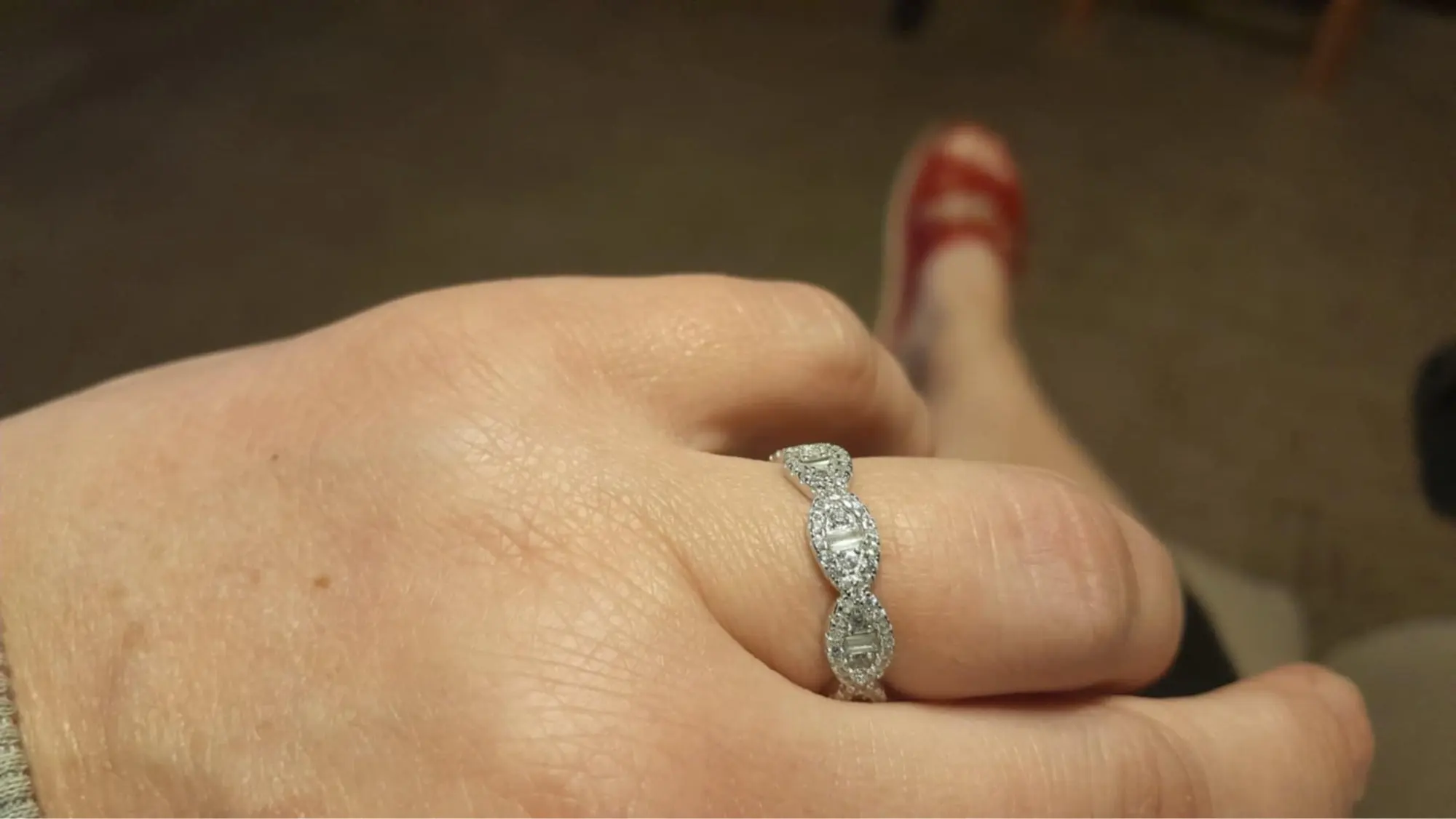 ✓ Clear CZ stones encircle the band for full eternity band ring brilliance