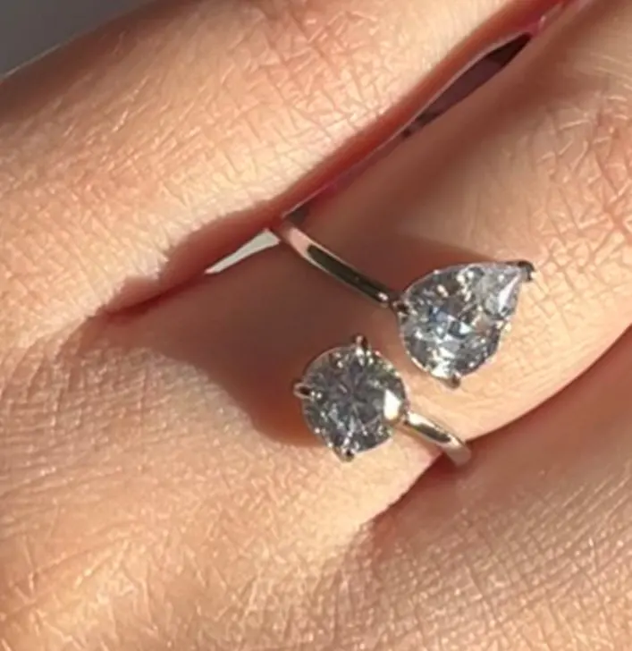 This exquisite sterling silver ring showcases a delicate interweaving design of clear cubic zirconia set in both water drop and round shapes, creating graceful movement and shimmer. The sterling silver construction lends durability and radiant shine to your jewelry collection. Offered in multiple ring sizes, this piece adapts seamlessly to your finger for a perfect fit.