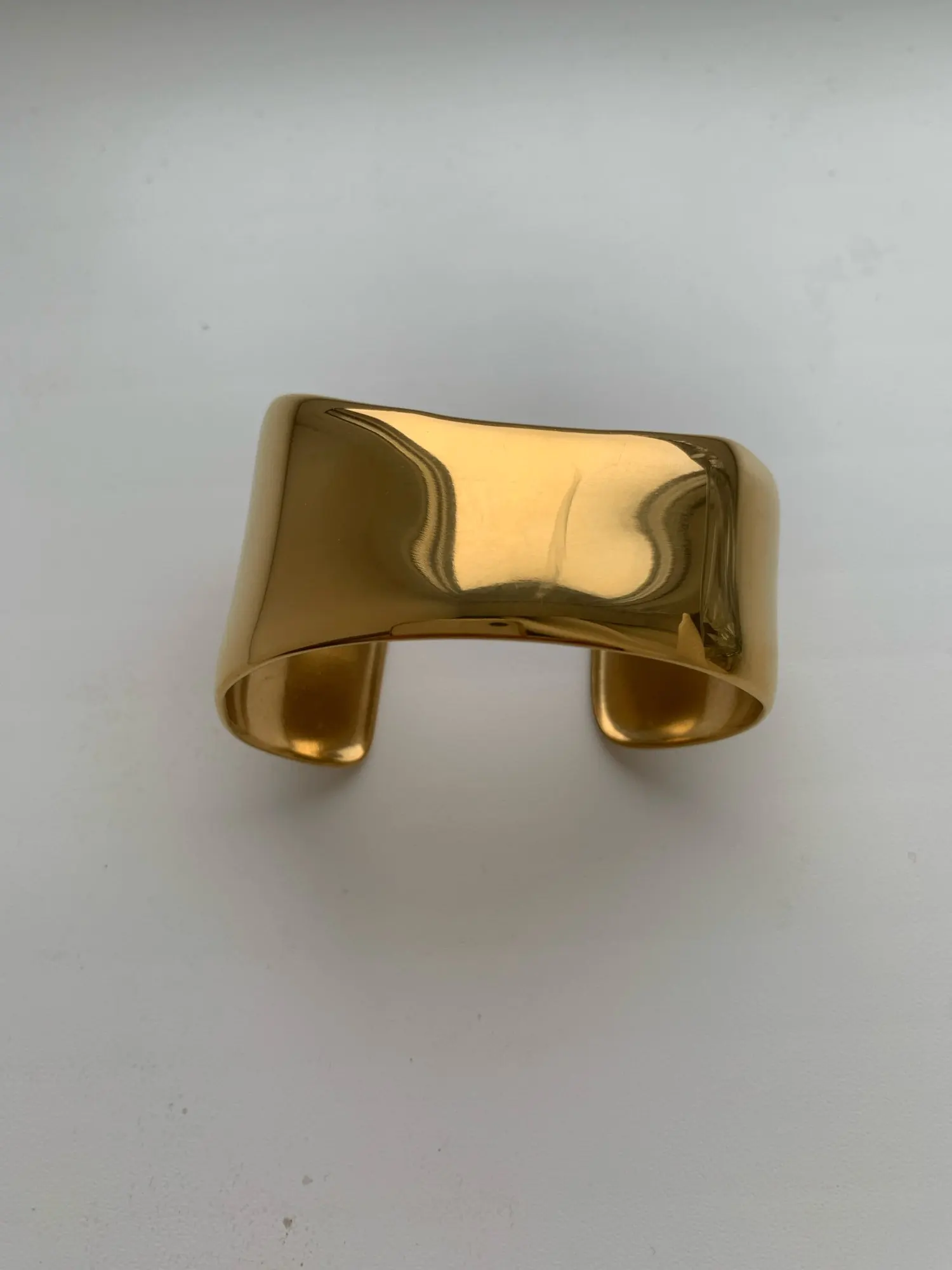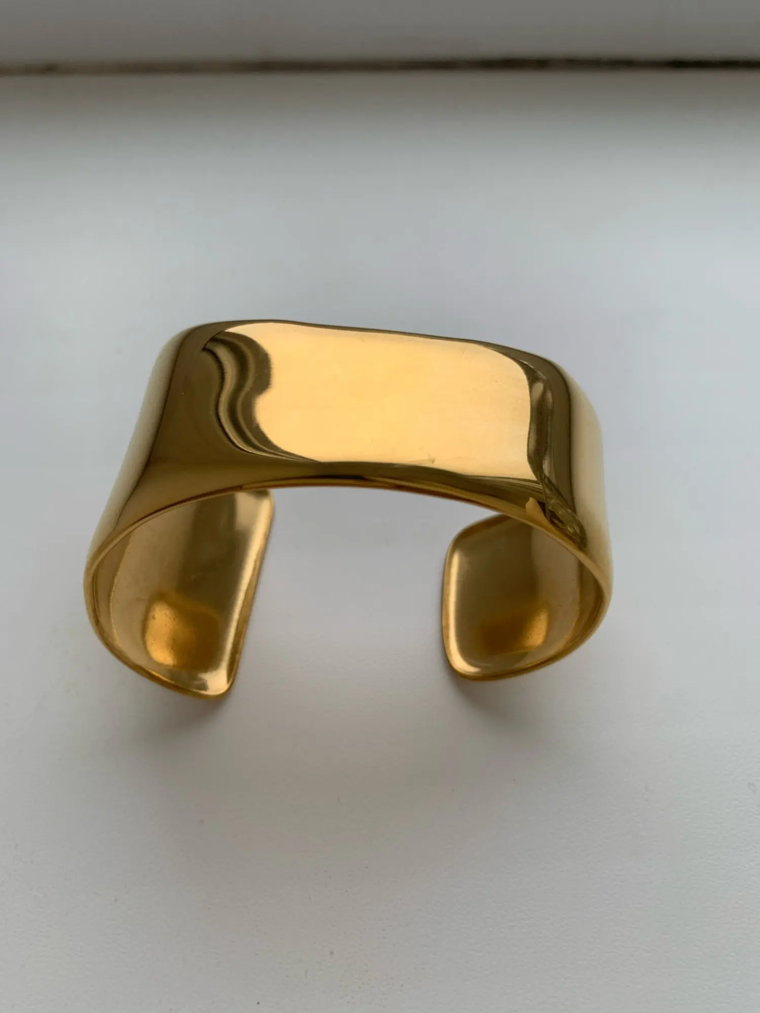 This statement cuff bracelet glows with a smooth gold plated finish, bringing modern presence to any look. Designed for easy pairing, it complements gold jewelry staples and dresses up casual fits with ease. A bold yet refined bracelet with gold character made for everyday confidence.