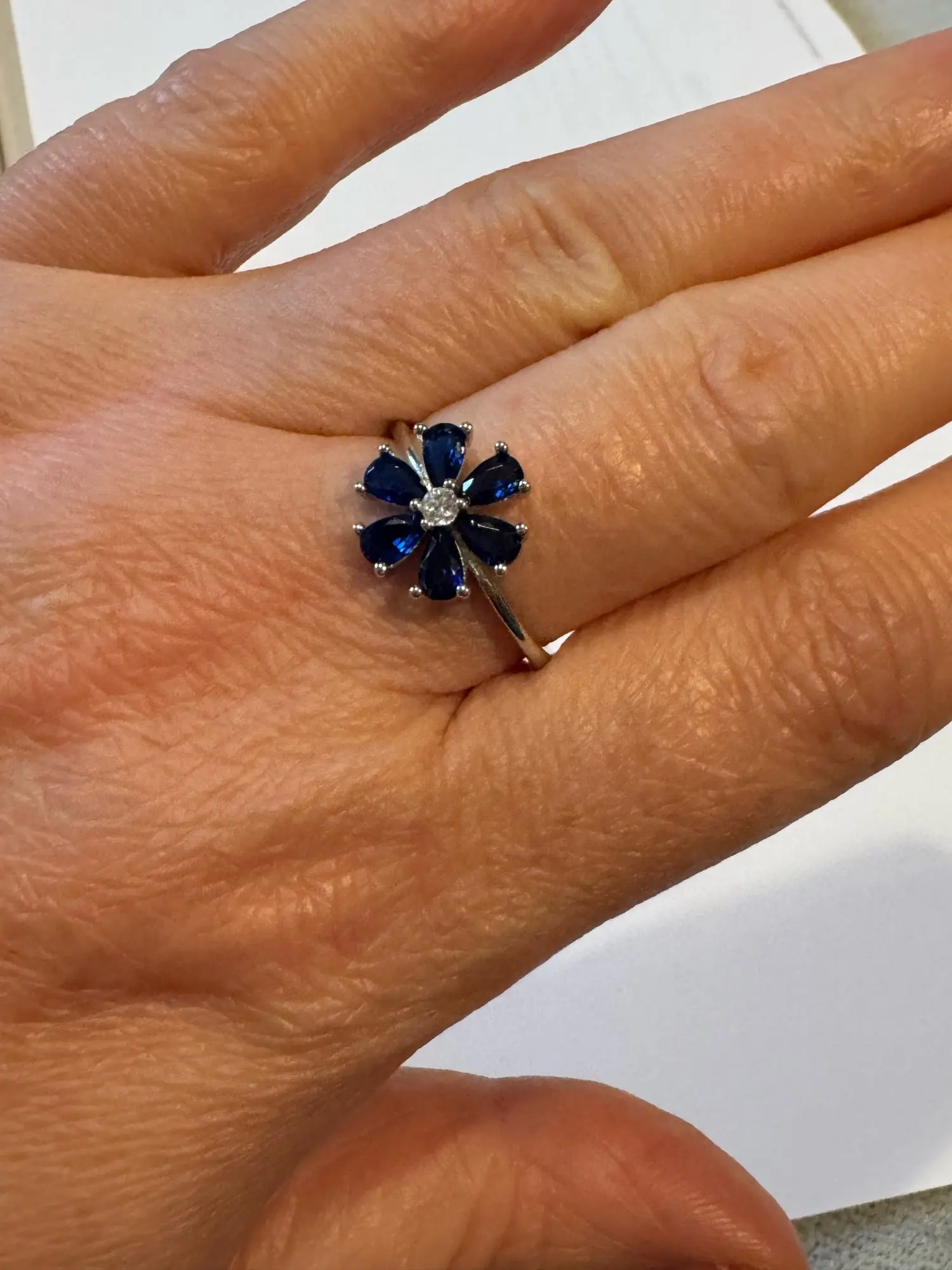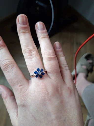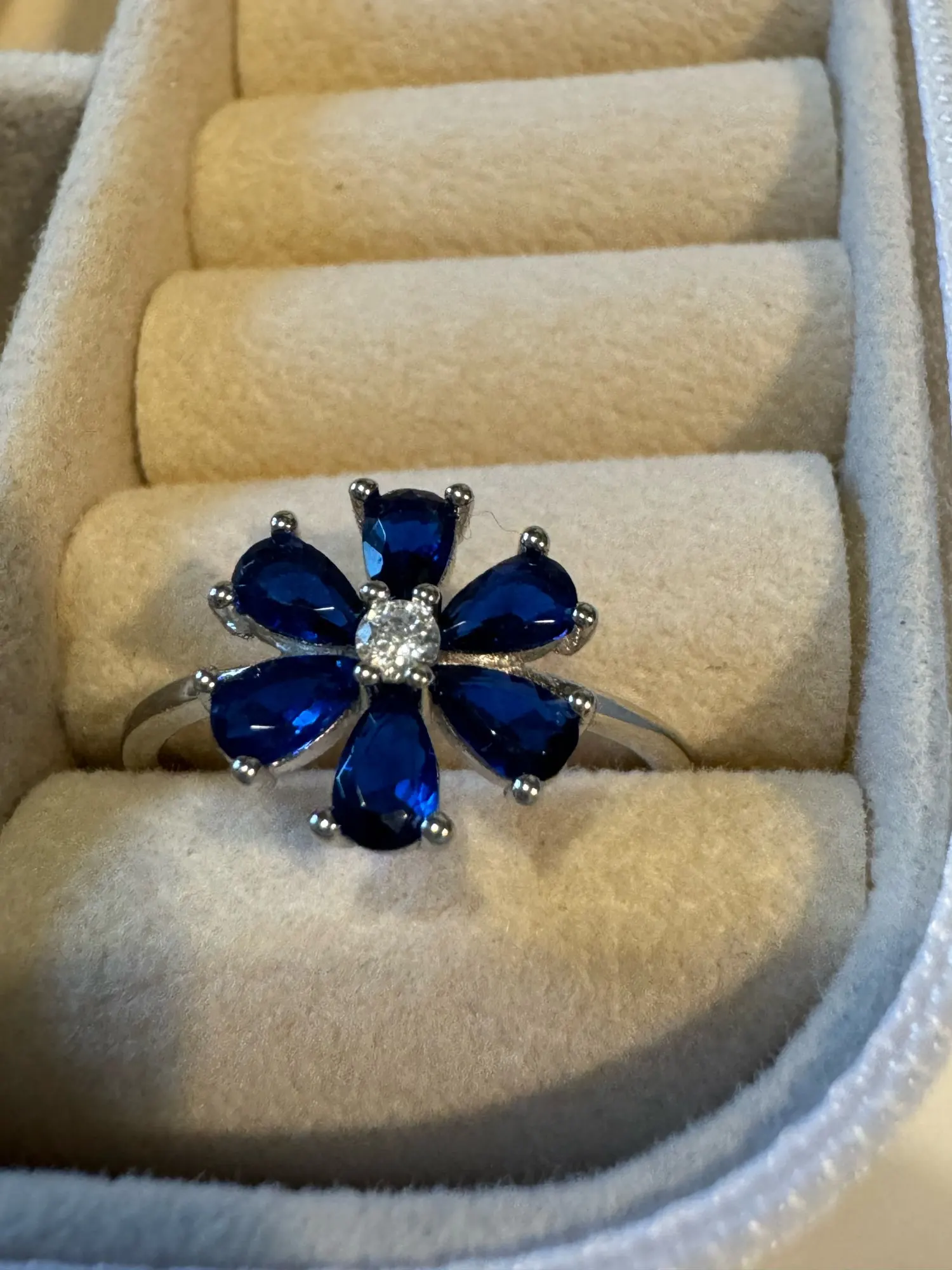 This elegant silver color piece features a vivid royal blue centerpiece framed by a subtle flower motif in 925 sterling silver. Designed to mix with jewelry sets, the ring offers a smooth profile for everyday wear and special moments. Simple ring size guidance helps you choose the right fit with confidence.