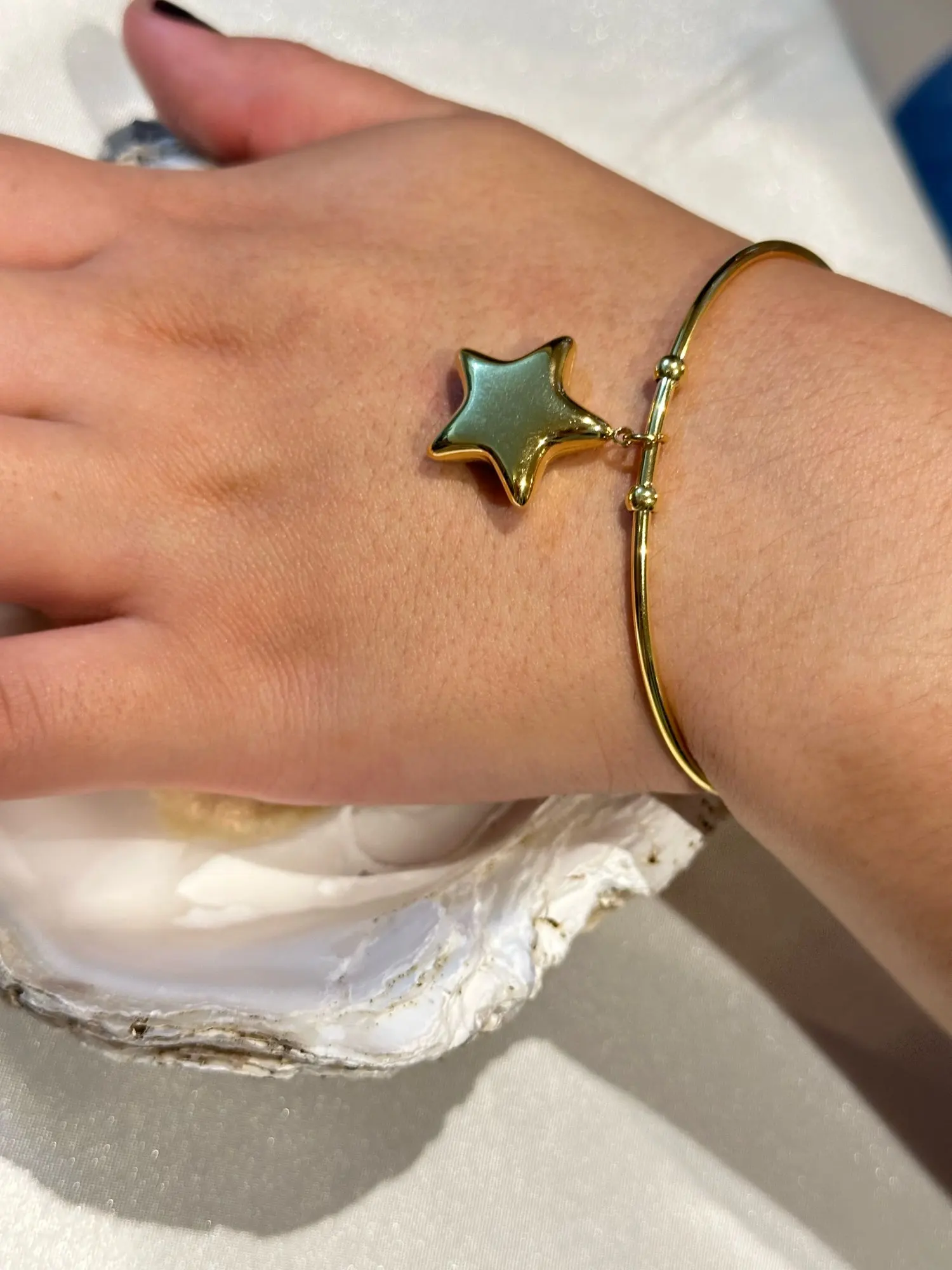 This open cuff bracelet radiates star-studded beauty with a bold stainless steel body plated in gold for a striking finish. The 66 mm design offers an eye-catching gold cuff that suits both casual and dressy looks. With its modern star motif and metal durability, this bracelet with gold flair brings cosmic elegance to your wrist.