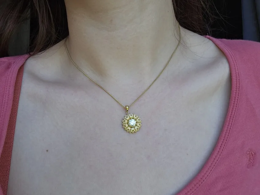 This sunflower pendant necklace features sparkling cubic zirconia set in durable stainless steel, plated in gold or silver color, and designed to be waterproof for all-day wear. A delightful choice for women who love nature-inspired jewelry with a touch of glamour.