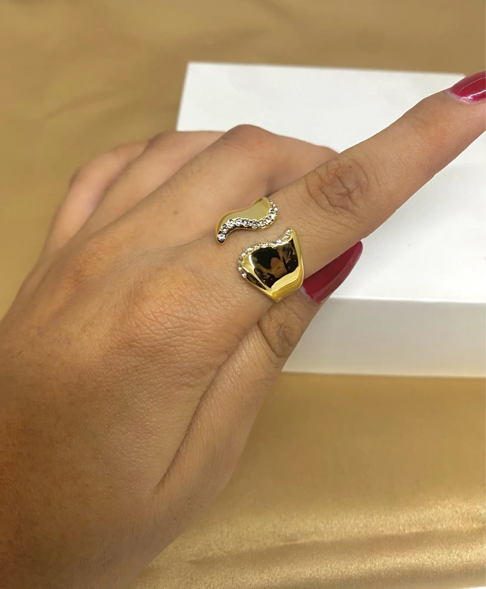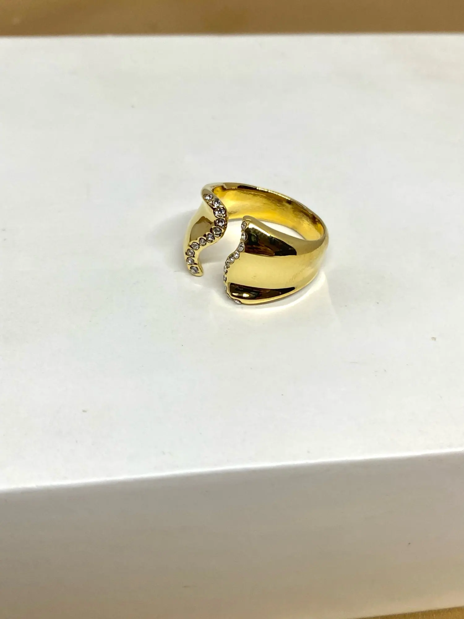 This open gold ring curves in a graceful wave, inlaid with brilliant cubic zirconia for refined sparkle. The gold plated finish adds warmth, while the sleek form feels like fashionable jewelry made for every day. Subtle yet striking, it balances shine with effortless style.